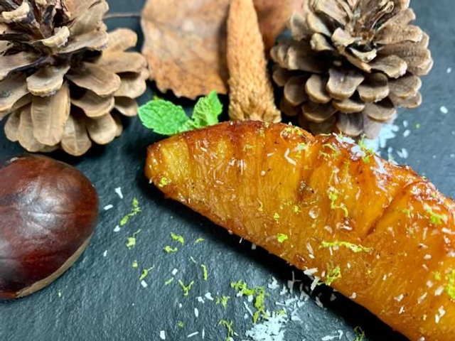 Carpaccio de Champignon de Paris, persil plat & pignon de pin, Pavé de Cabillaud confit & riz gingembre, Ananas rôti - Délai de commande 48h. En livraison, contact@rivegauchereception.fr ou 0982314040.